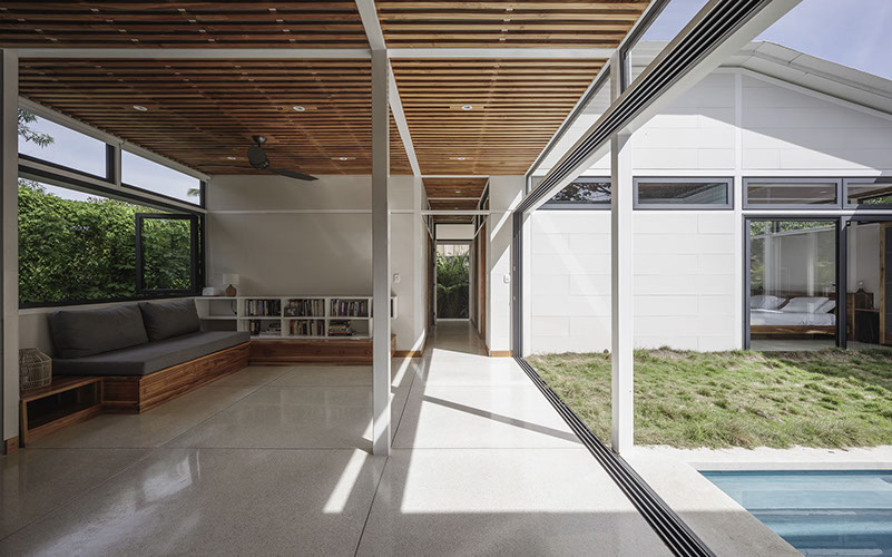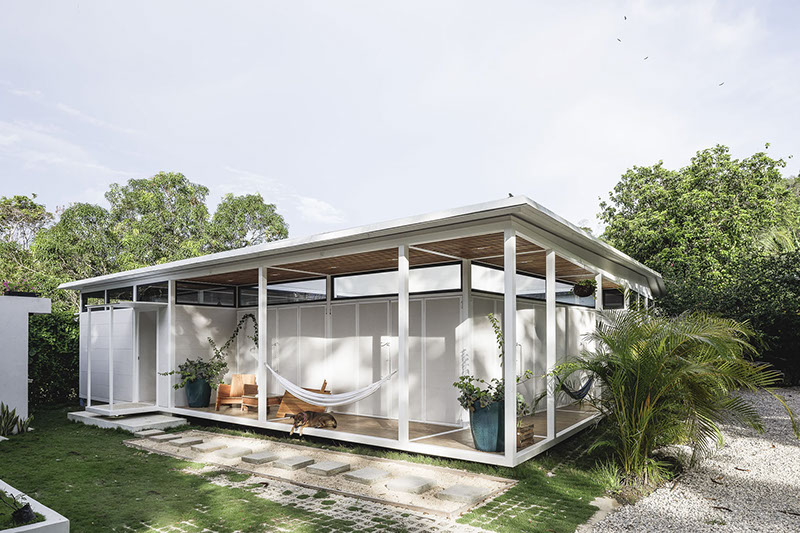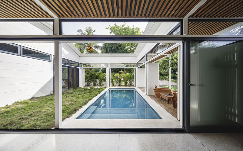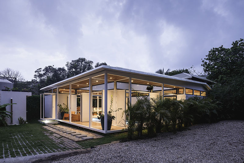 El diseño de Casa Jícaro se combina audazmente a través de un patio descentrado y con una plataforma flotante. no solo ha conquistado las limitaciones del terreno, sino que ha creado un oasis privado a la sombra de una majestuosa cubierta que beneficia el entorno ecológico